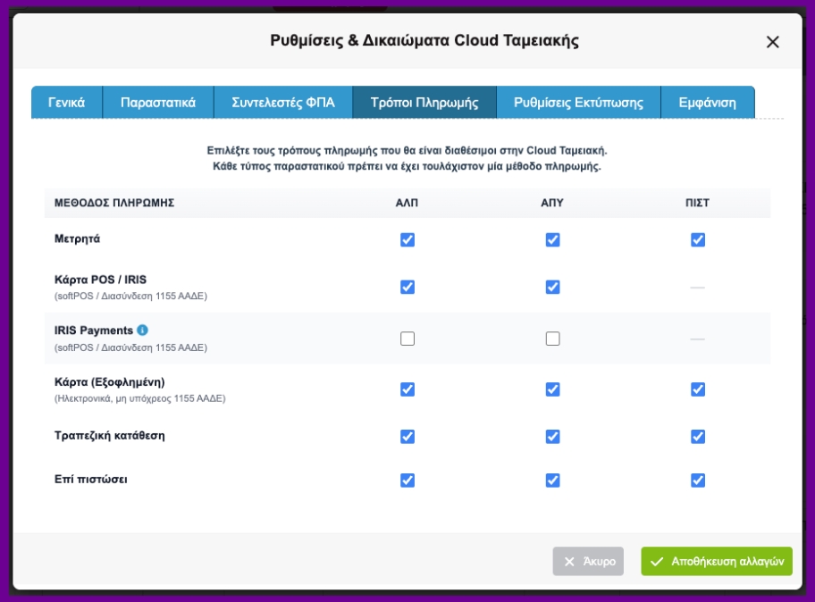 1. Διαχείριση τρόπου πληρωμής ανά χρήστη στη Cloud Ταμειακή