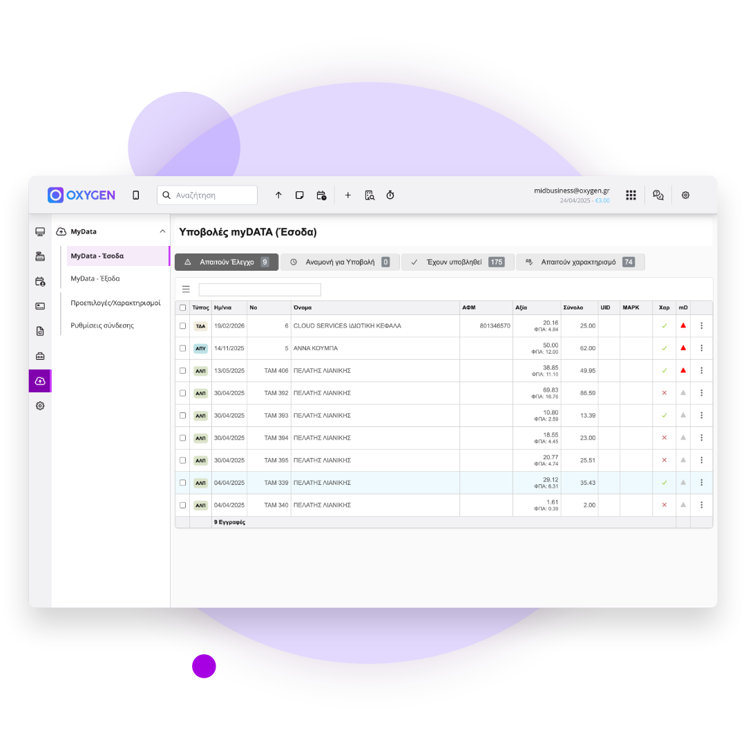 - Σε όλους τους χρήστες του Oxygen ERP & Cloud Ταμειακής που επιθυμούν την αυτόματη διαβίβαση στο myData.