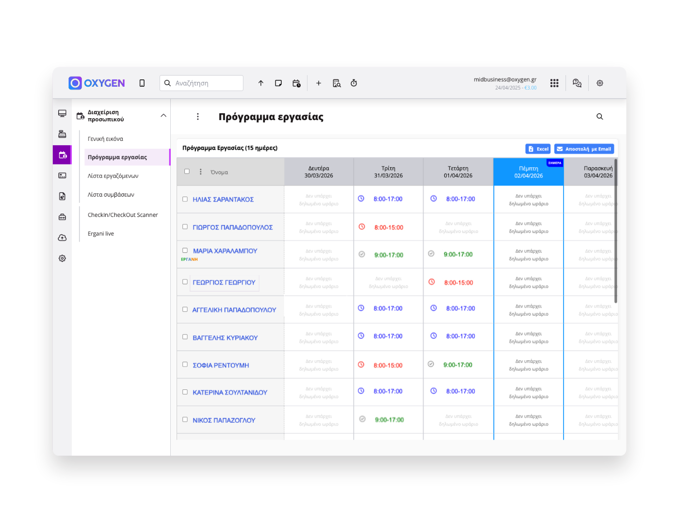 - Έχει πρόσβαση στη λίστα εργαζομένων και το ωράριο εργασίας